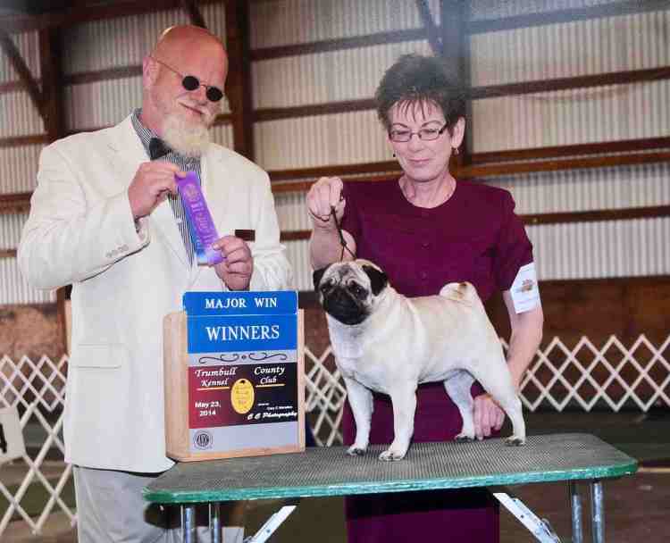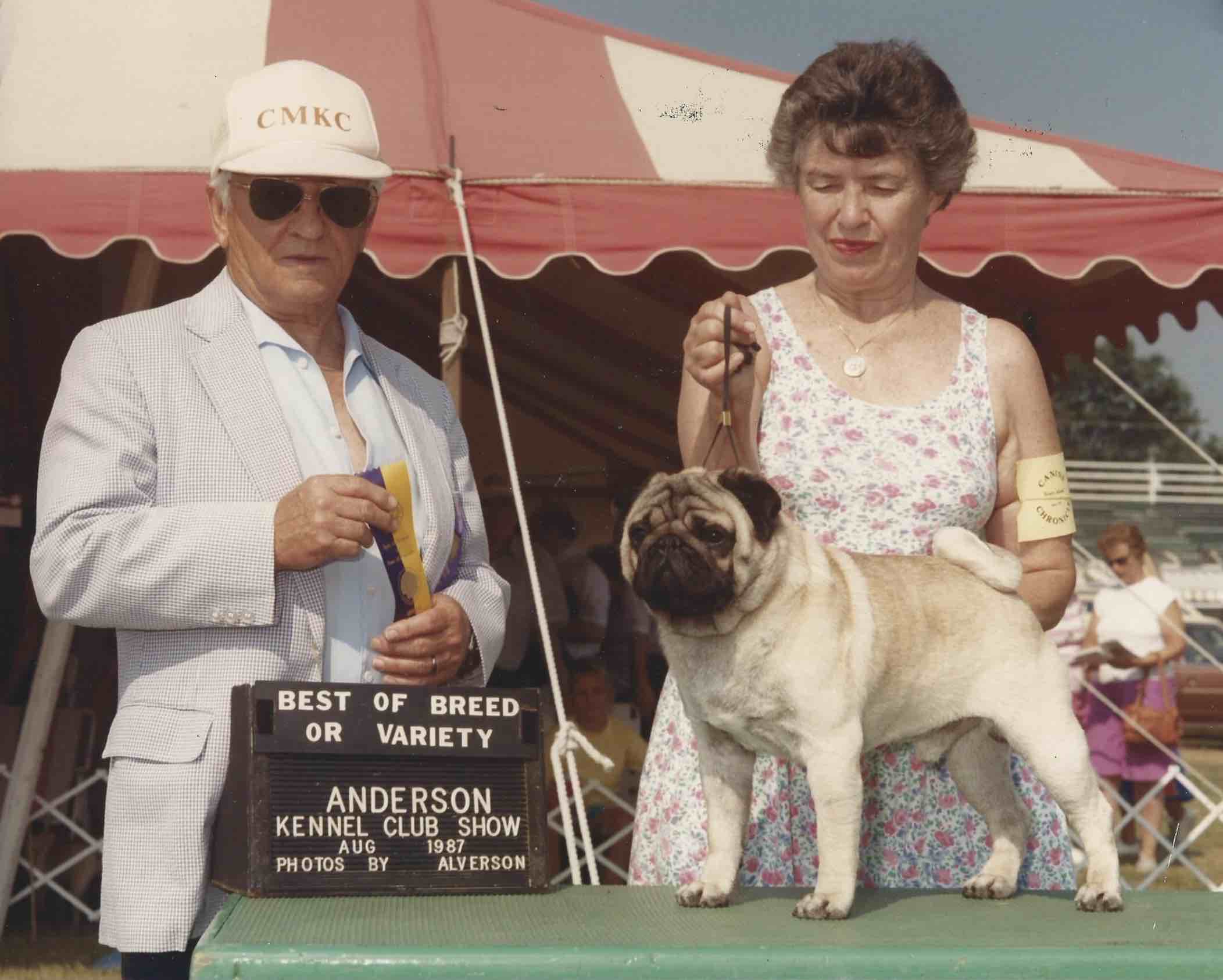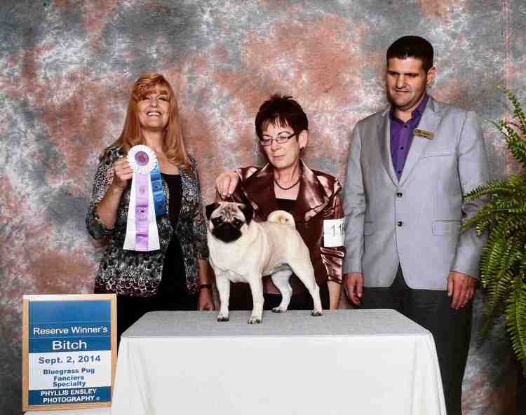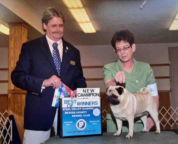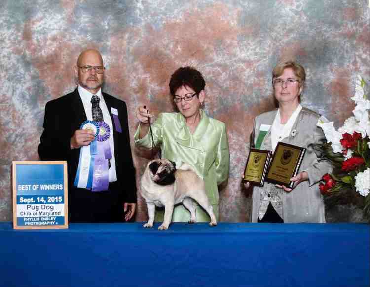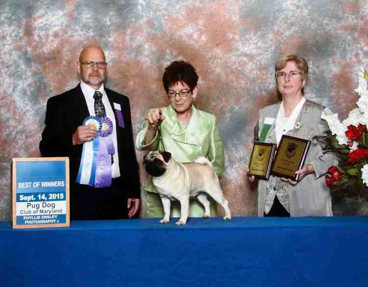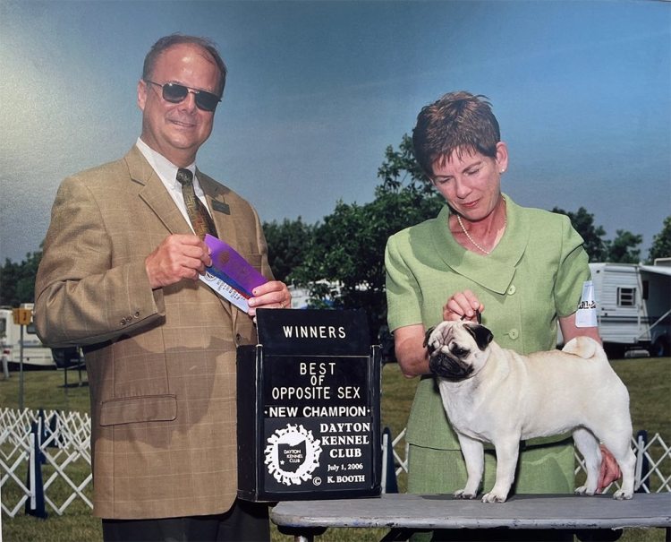 Bama’s championship, along the championships of his Sister, SKYLAR, and his Half-Sister, SHADOW, gave their mother, Marisa, (CH SHEFFIELD’S BUTTERFLY WISHES) the prestigious REGISTER OF MERIT (ROM) award offered by the Pug Dog Club of America. This award recognizes pug bitches who have produced three or more champion offspring.