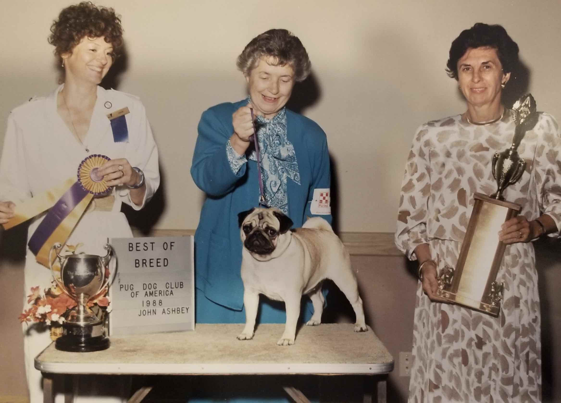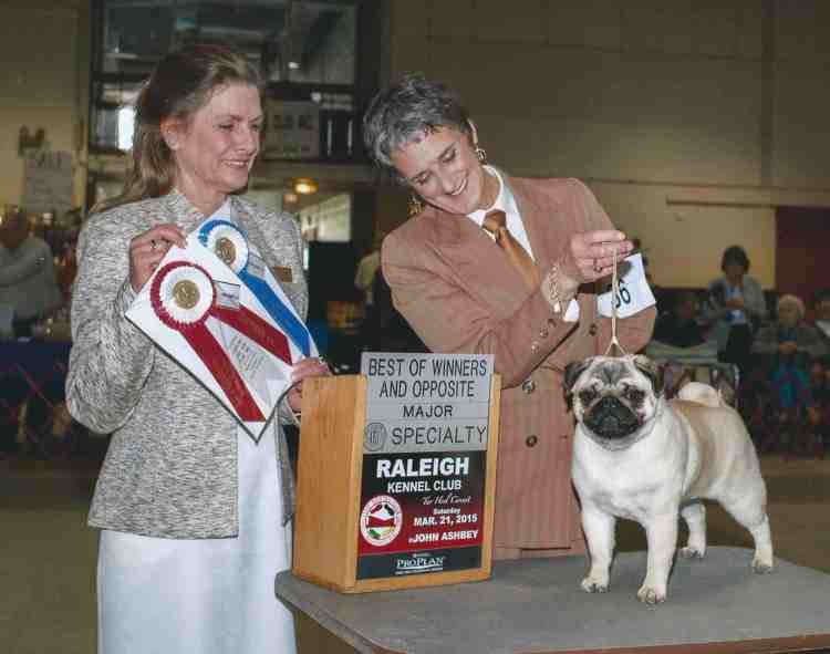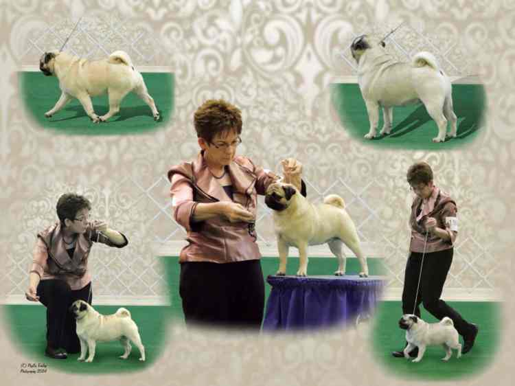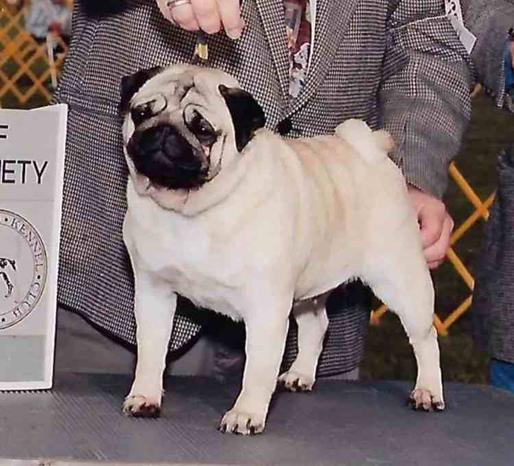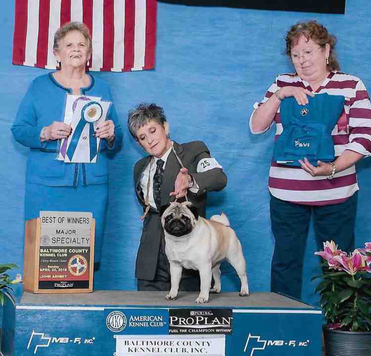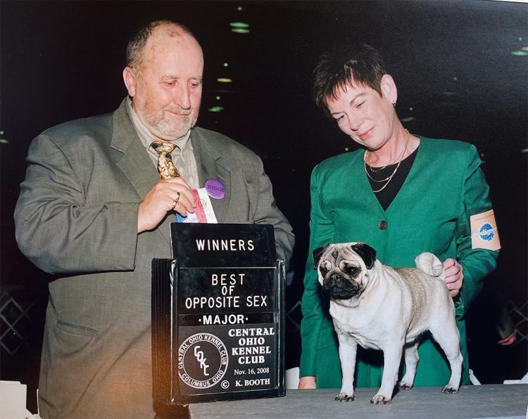 Bama’s championship, along the championships of his Sister, SKYLAR, and his Half-Sister, SHADOW, gave their mother, Marisa, (CH SHEFFIELD’S BUTTERFLY WISHES) the prestigious REGISTER OF MERIT (ROM) award offered by the Pug Dog Club of America. This award recognizes pug bitches who have produced three or more champion offspring.