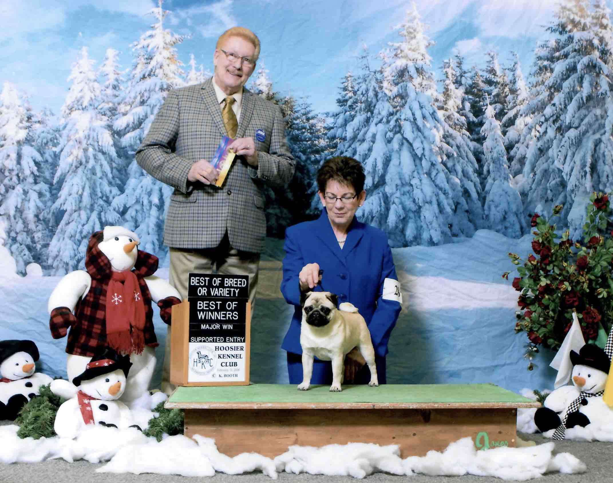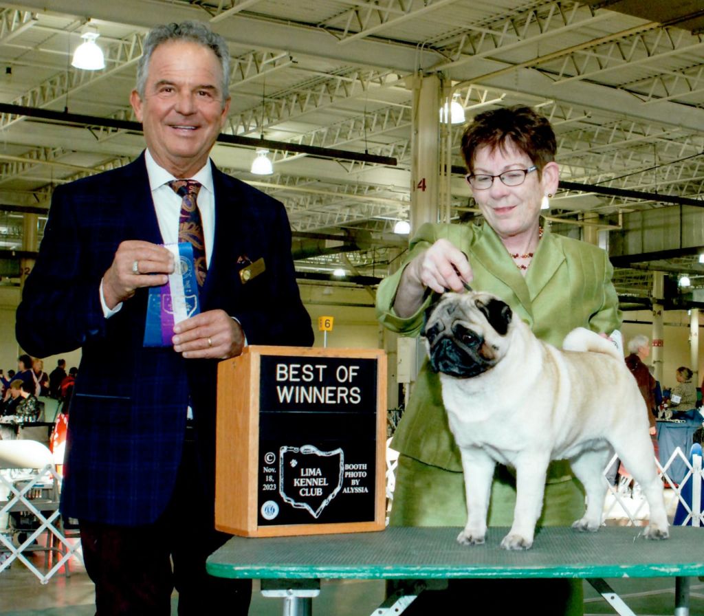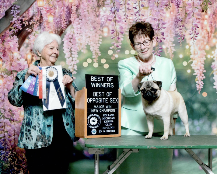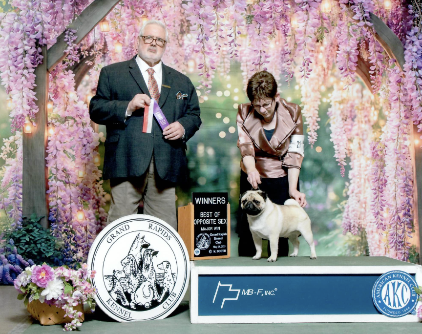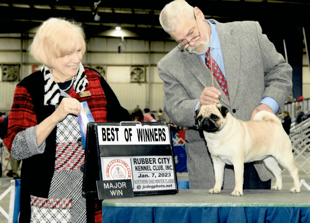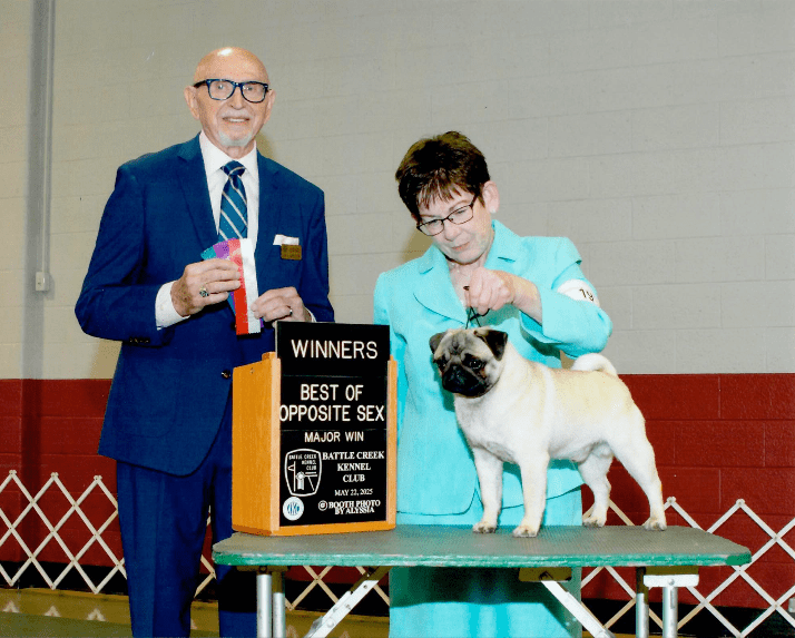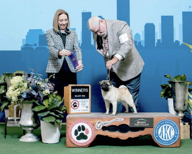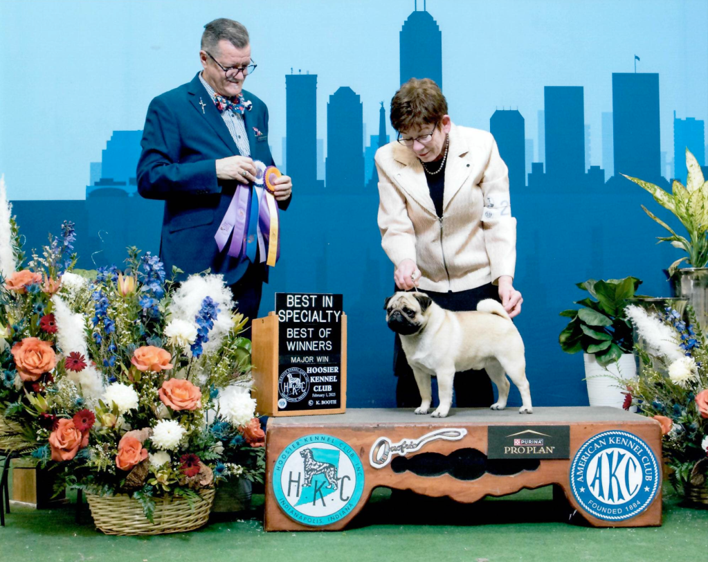 Brade won a 5-pt major from the Bred By Exhibitor Class going BEST OF BREED (over Specials) at the Central Indiana Pug Club Specialty on 2/1/2025