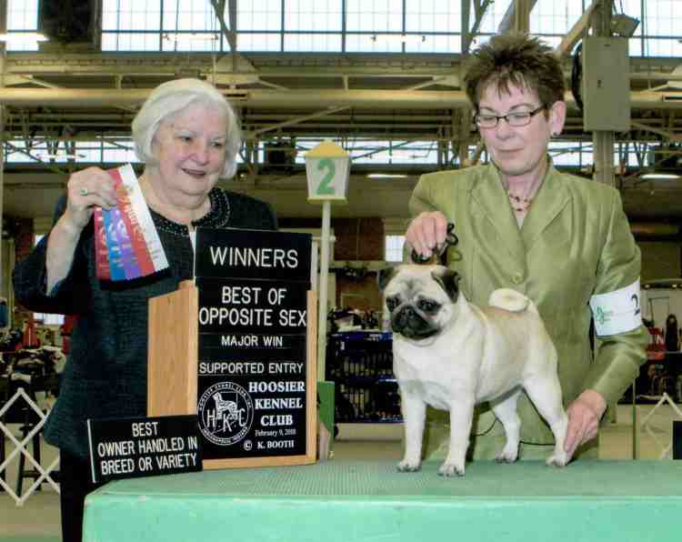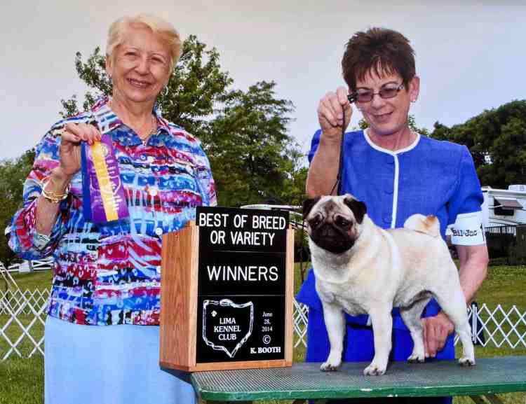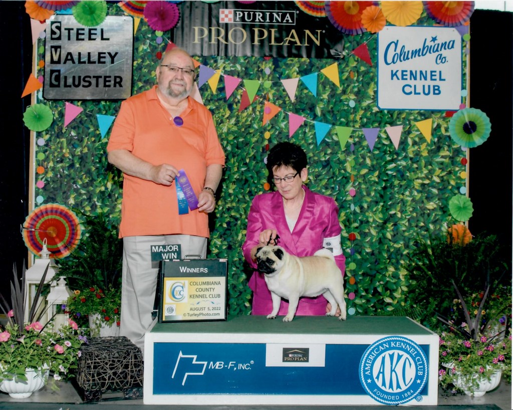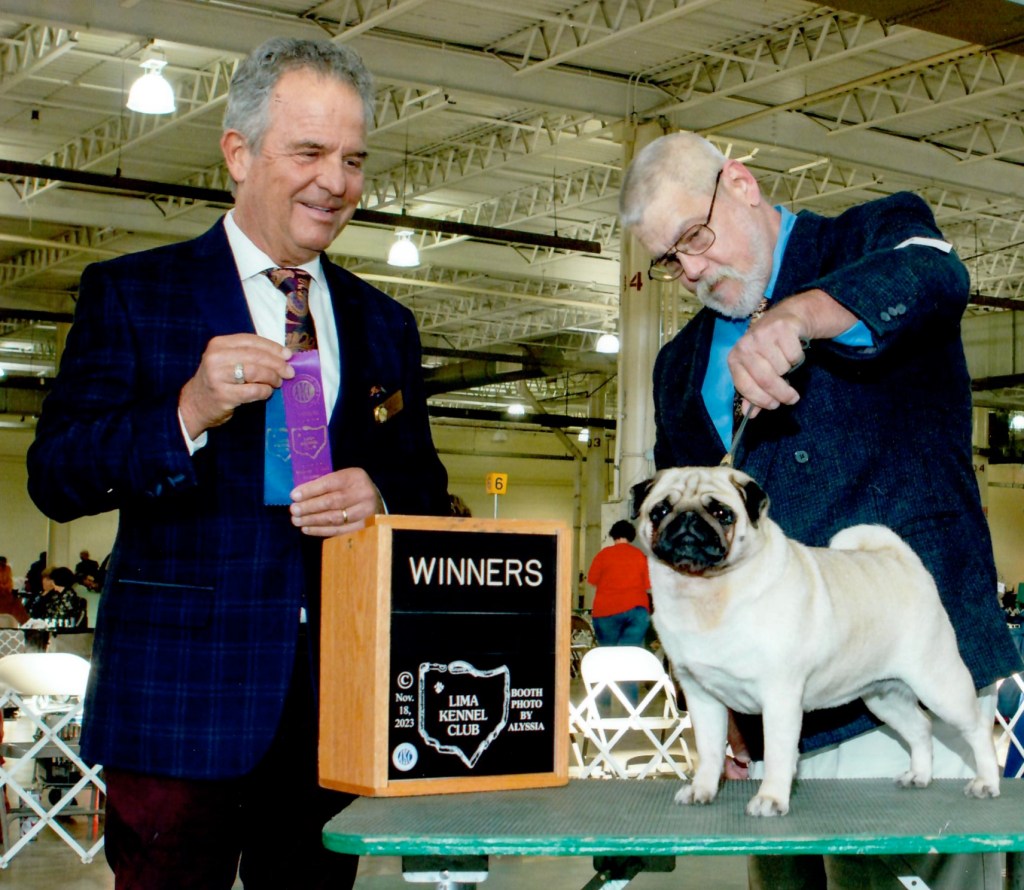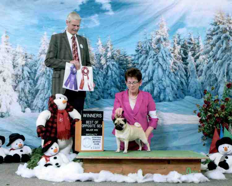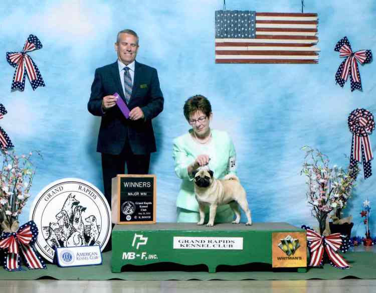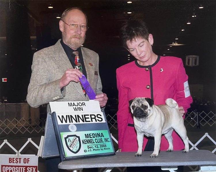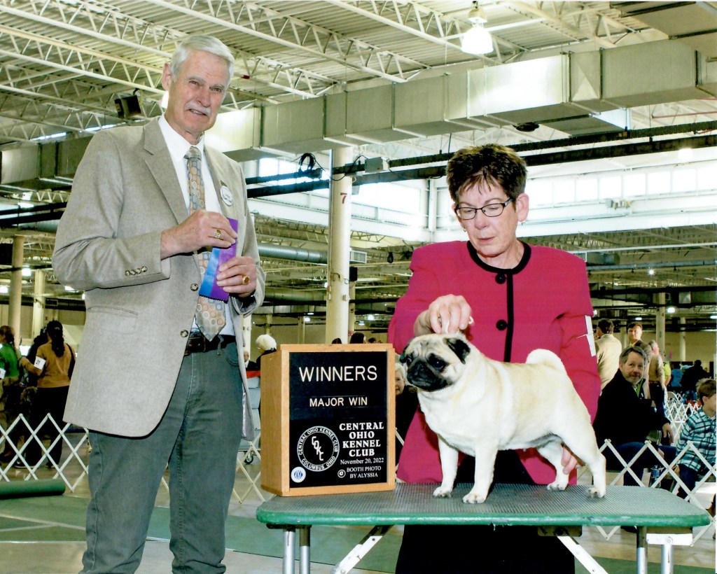 Brade won a 5-pt major from the Bred By Exhibitor Class going BEST OF BREED (over Specials) at the Central Indiana Pug Club Specialty on 2/1/2025
